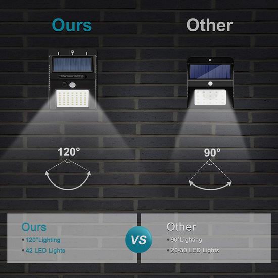 配备42个超亮LED灯珠和大功率太阳能充电板,探测角度高达120度,有效探测距离10-16英尺,IP65级专业防水,白天充满电后可持续照明8-10小时。可安装于前后院与车库门口,智能感应周边移动物体。