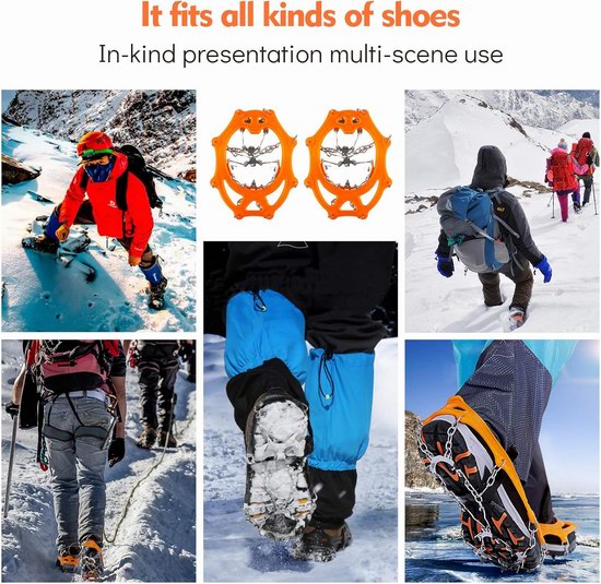 此款防滑鞋套可套在各种鞋靴上使用,在冰雪、泥泞等恶劣条件下行走时,减少因滑倒的风险。