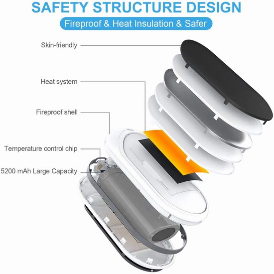 采用优质铝合金+ABS外壳,鹅卵石造型,防烫、防滑,3秒内双面快速均匀加热,三挡温度(40~45℃、45~50℃、50~55℃)满足不同需求,最长可加热4-8小时。同时,还具有充电宝功能,可为手机补充电力。