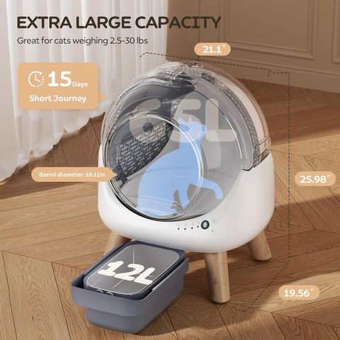 这款多猫家庭专用自动清洁猫砂盆操作便捷入口宽敞12 英寸顶部开口可容纳体重达 30 磅的猫咪智能系统自动分离结块并密封储存,保持家中无异味。支持 App 控制,通过 2.4GHz Wi-Fi 远程管理猫砂量、查看使用记录、接收维护提醒,并可切换自动/手动清洁(幼猫模式更温和)密封垃圾仓+防臭袋+防漏垫让家中空气清新,12L 大容量无需频繁维护,可连续使用约 15 天。红外感应、重量检测、靠近即停等全方位安全防护,让猫咪使用更安心。不粘硅胶网格过滤干净、宽敞入口适合大体型猫,是忙碌家庭及多猫家庭的理想智能猫砂解决方案。