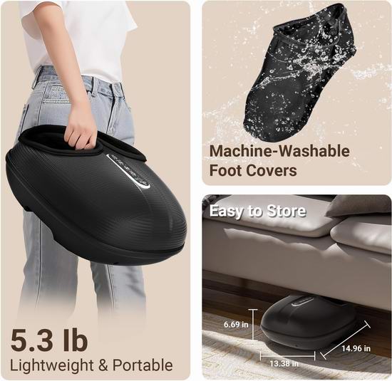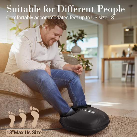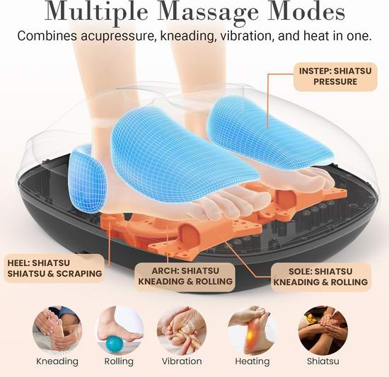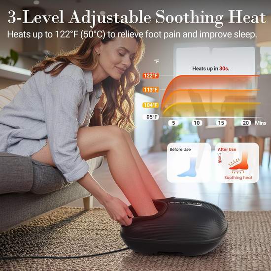 这款足部按摩器内置3个旋转按摩头,结合滚动按摩节点、振动按摩节点和全方位压力,带来深层揉捏的指压按摩体验。拥有5档3D按摩模式,可同时作用于足背、足侧和脚踝,精准刺激穴位,模拟专业按摩师的手法。多功能设计促进血液循环,缓解疲劳,恢复足部活力。提供三种温度设置(45℃、50℃、55℃),可温暖冰冷僵硬的双脚。有助于改善血液循环、缓解疲劳并提升睡眠质量。具有15分钟自动断电定时功能,可防止双脚长时间受热。配备了遥控器,方便操作。
