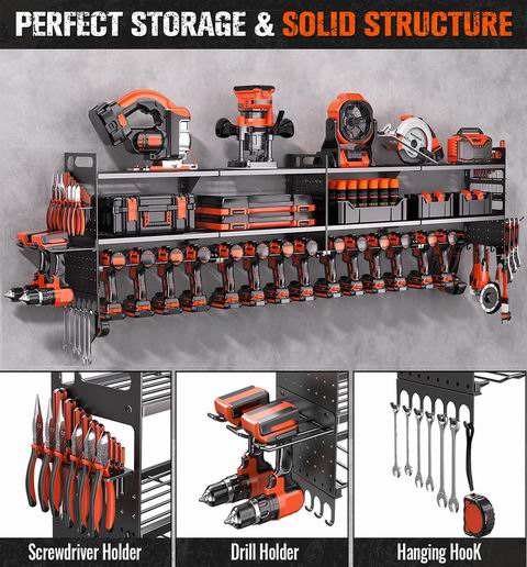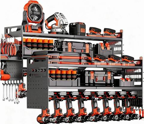 大型电动工具壁挂式收纳架2件套 ,主打“车库空间最大化 + 重型承重 + 模块化定制”。66 英寸超宽三层结构可整齐收纳多达 18 件无绳电动工具,并额外预留小物件置放空间;采用加固焊接钢架与防锈防弯涂层,整体承重最高可达 600 磅,适合存放较重的电动工具与配件。侧板与层板高度支持灵活调整,可按习惯自定义挂放锤子、卷尺、螺丝刀等工具;兼容混凝土、砖墙、石膏板与木墙等多种墙面,适用于车库、工作室、维修间或仓库,也是送工具爱好者很实用的礼物。