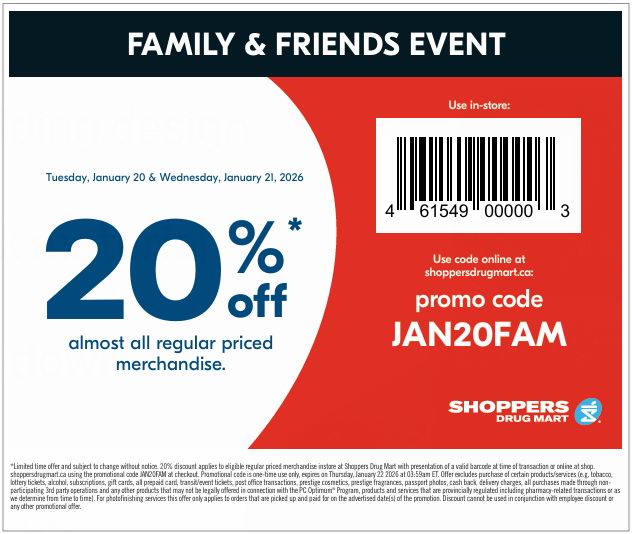 Shoppers Drug Mart网店及店内销售,1月20日-21日(星期二至星期三)期间,购买正价商品,使用折扣码:JAN20FAM (店内结账时出示以下优惠券,可手机展示或打印),即可享受8折优惠(可使用积分付款,减价款无额外折扣),点此进入网店页面。