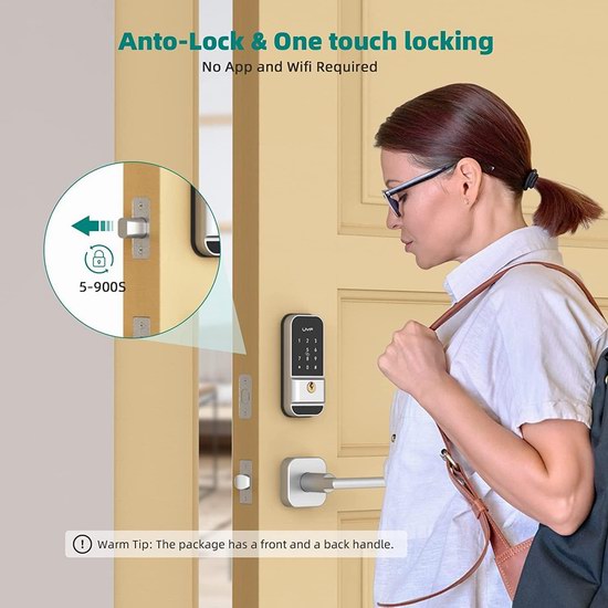 这款智能门锁支持3种开锁方式,包括密码、IC门卡和钥匙,可设定250组密码,具有更大灵活性和安全性,就连老人和儿童也能快速开锁。采用银行级加密算法,所有用户数据只存储在门锁本地系统中,不会上传到云端。加密安全性极强,用户无需担心黑客窃取密码。此外,无需连接任何Wi-Fi或APP即可使用锁的所有功能,有效避免因网络或云问题导致的使用不稳定。无需手动上锁,不在家时可开启自动上锁,自动锁定时间可设定5到900秒,再也不用担心忘记上锁。内置加密防盗系统,密码输错5次后自动锁定。电量不足时,会提前发出警报,此外,锁底部USB C接口,可在紧急情况下为门锁充电。