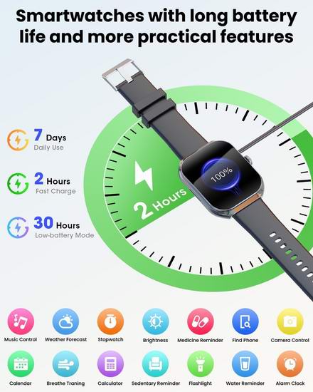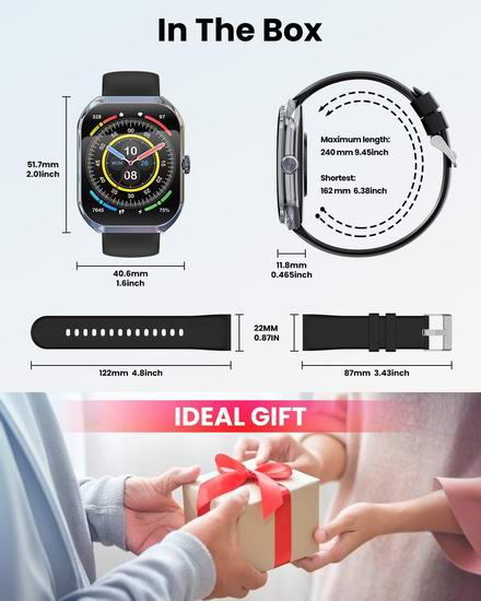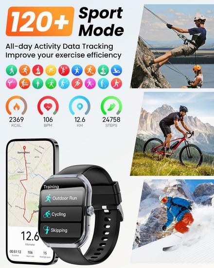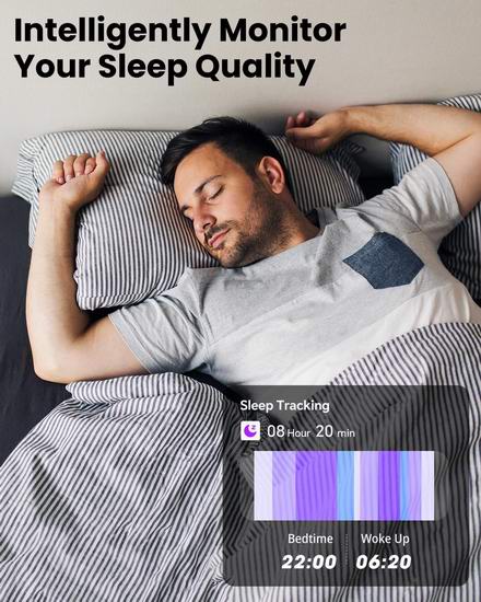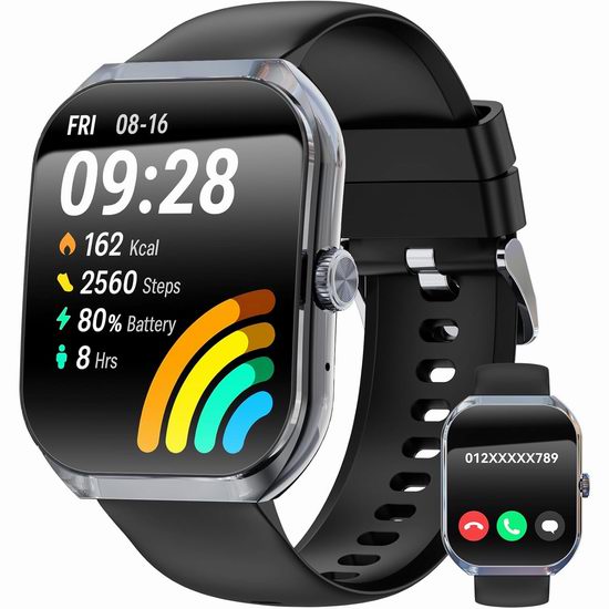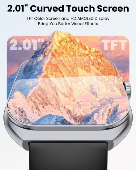 这款智能手表采用2.01英寸高清曲面触控屏,带来更清晰的视觉效果和更灵敏的触控体验。具有120多种表盘,支持上传照片定制专属表盘背景。内置麦克风和高清扬声器,通过蓝牙连接后,您可以使用手表接听/拨打/拒接电话、查看通话记录、同步联系人,并且支持信息提醒(Facebook、WhatsApp、Twitter、Instagram)。提供120种运动模式,包括步行、跑步、骑行、游泳、徒步等。能实时记录您的运动数据,帮助您达成健身目标。配备先进的传感器,可监测心率、压力水平和睡眠质量,实时记录健康数据,并提供全面的睡眠阶段分析(深睡、浅睡、快睡),帮助您养成健康的睡眠习惯。提供天气预报、音乐和相机控制、闹钟、秒表、计时器、计算器、月经周期追踪、久坐提醒以及查找手机功能。兼容Android 5.0和iOS 9.0+智能手机。支持语音助手功能,连接蓝牙后,即可使用语音指令操作。