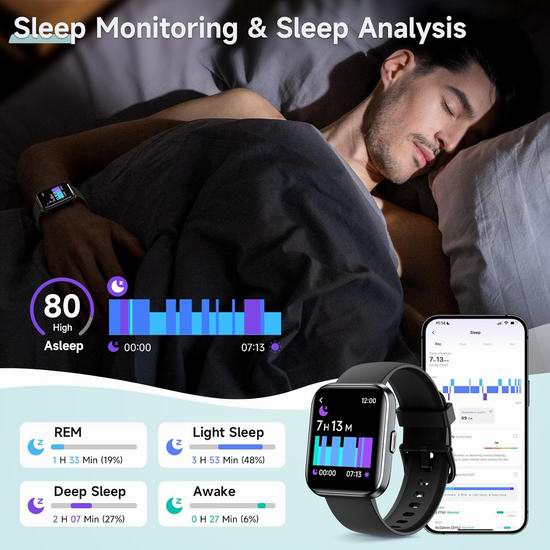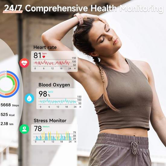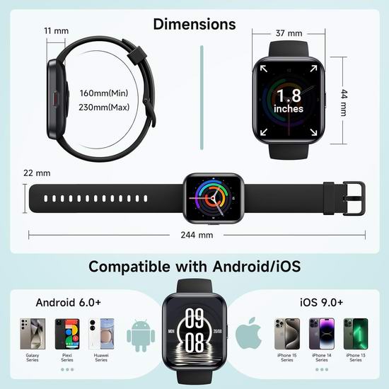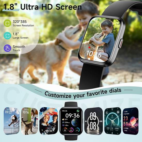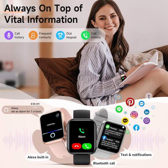 这款智能手表配备1.8英寸高清触控屏,采用蓝牙5.3技术,与手机配对后可拨打/接听/拒接电话,并可接收来自手机APP的通知,例如 Facebook、Instagram 等。还支持 Amazon Alexa语音控制,只需对着手表发出简单的语音指令,即可控制设备设置闹钟、播放音乐或获取最新天气预报。手表会自动记录您每日的步数、距离和卡路里消耗。先进的传感器会持续监测您的心率、血氧饱和度和压力水平。您可以将数据无缝同步到“Veryfit”应用程序,获取更深入的健康洞察,指导您做出更明智的选择。