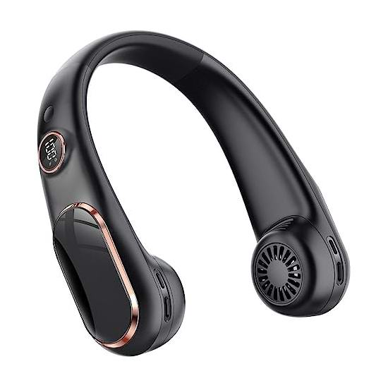 免提颈挂式设计,看起来像耳机,可以解放双手享受凉爽。小巧重量轻,便于随身携带。无叶风扇,不必担心头发缠结。内置LED显示屏,可显示电量和当前速度,4档风力调节。内置 4000mAh 电池,续航时间长达14小时。