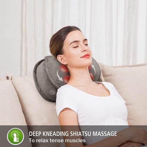 Snailax 深层指压加热按摩器/按摩枕,其外罩由 100% 超舒适的长毛绒制成,柔软舒适,可完美贴合身体曲线,内置4个深度按摩头,模拟人手轻柔揉捏按摩,按摩头具有红外加热功能,促进血液循环,可以按摩颈部、背部、肩部、腰部等处,放松关节肌肉,有效缓解疲劳。轻巧便携,放在家里、办公室座椅和沙发上都可以用、非常方便。