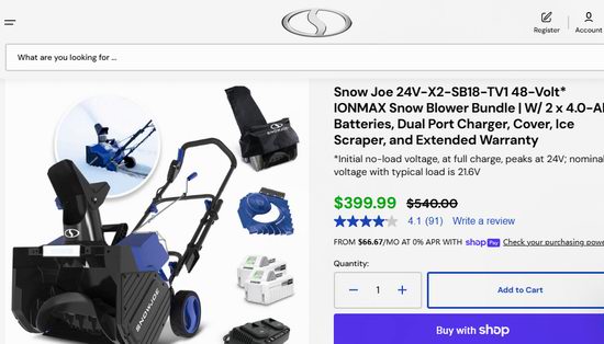 Snow Joe 48V 18英寸 1200W 无绳铲雪机6.3折 475.01加元包邮!
