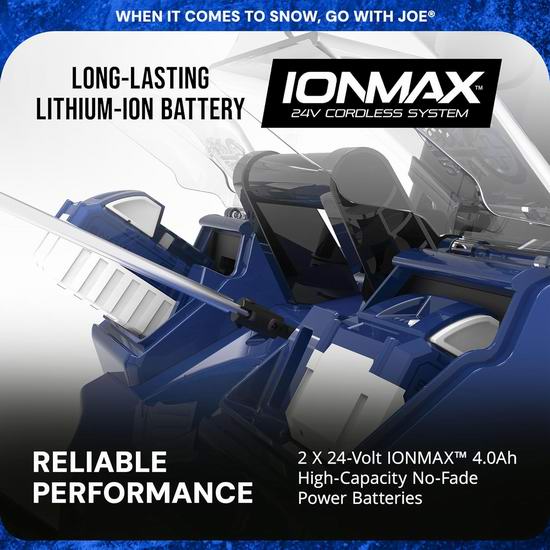 搭载1200W强力无刷电机:Snow Joe IONMAX 每次充电可清除高达14吨的积雪,即使是最厚重、最顽固的积雪也能轻松应对。具有18英寸清扫宽度,10英寸清扫深度:轻松切开厚重的积雪。配备24V 锂电池(2 x 24V,总功率48V)提供无汽油、无绳动力,实现最大程度的移动性和轻松使用。可180度精确控制雪的排放方向,最远可达 20 英尺,保持周围环境畅通,防止雪在不希望的区域积聚。内置LED前灯,即使在天黑后也能照亮道路,确保安全除雪。