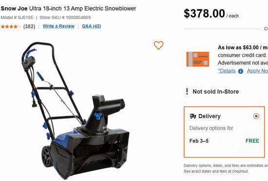 Snow Joe Ultra SJ618E 13安培18英寸电动铲雪机5折 188.99加元包邮!HomeDepot同款378加元!