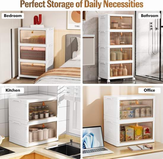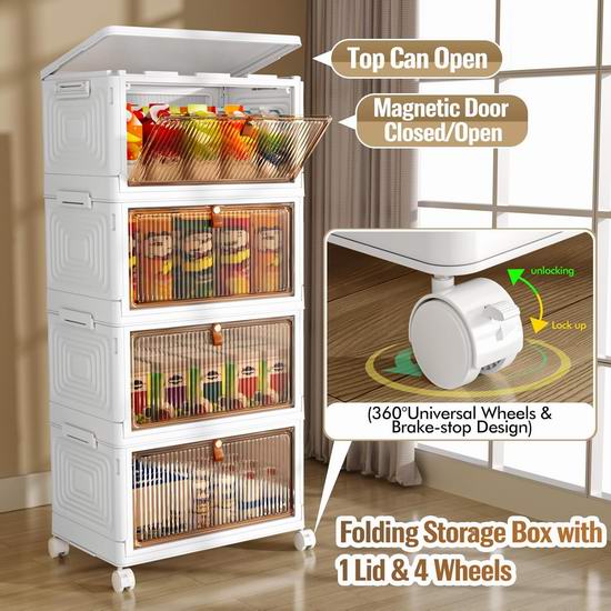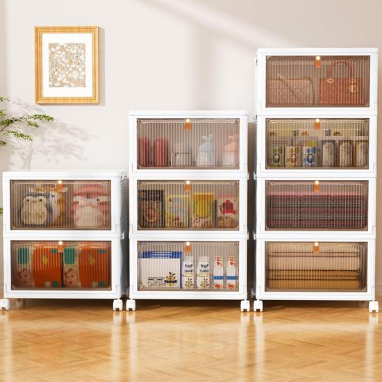 采用优质PP材质,组装后即可牢固使用,也可拆卸单独使用。带盖收纳柜有两种打开方式。可以打开顶盖,也可以从前门打开。前门开关带有磁铁,可确保门不会自动打开。总容量92夸脱,每层尺寸为15.35*11*8.27英寸。底部设有可固定轮子,方便移动。适合分类收纳玩具、工艺品、照片、药品、零食、化妆品等,也可用作车库、衣柜、卧室、浴室、办公室或食品储藏室的额外储物空间。外形尺寸为83.5 x 39 x 27.9厘米。