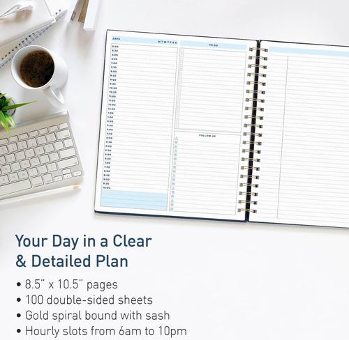 这款每日计划器笔记本是一款赋权工具,帮助您以最高效的方式利用时间,主动设定议程以保持专注,将工作和个人生活结合成一个有效结构。按小时管理日程,制作任务列表,记录后续联系人,并记下一般笔记,让您掌控每个工作日。同时,帮助您平衡生活,留出时间用于社交活动、冥想和小睡,实现目标的同时享受与家人朋友的乐趣。由120gsm双面纸制成,坚固的封面和内置腰带设计便于携带和使用,无论身在何处,都能直接开始工作。