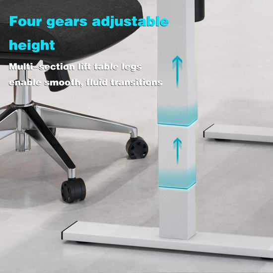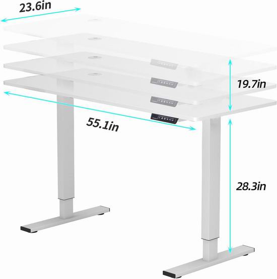 这款电动升降桌配备宽敞的55.1 x 23.6英寸P2级刨花板桌面,提供充足的空间;采用加厚管材结构,确保稳定性和耐用性;其坚固的框架和扎实的结构可以承受重物而不影响稳定性。符合人体工学设计,可记忆4档高度,升降范围为28.3至47.2英寸,让您轻松切换坐姿和站姿,从而改善姿势,降低肌肉骨骼问题的风险。配备高品质电机,升降速度为每秒1英寸,运行平稳安静,噪音低于50分贝,即使在最安静的房间里也能确保安静的工作环境。配备两个 Type-C USB 充电口,为您的设备提供多样化的连接选择。