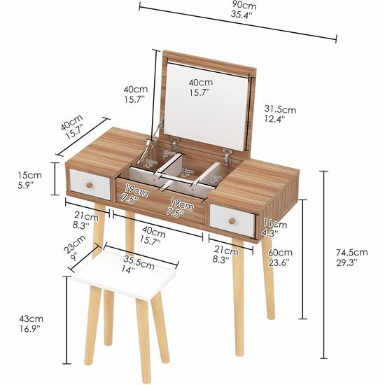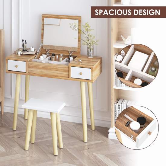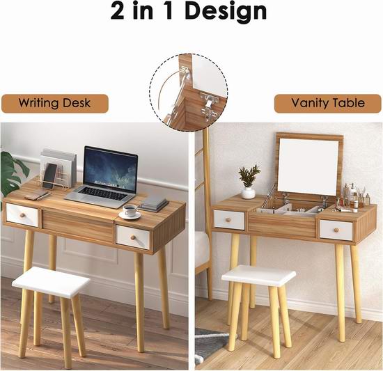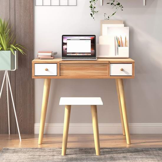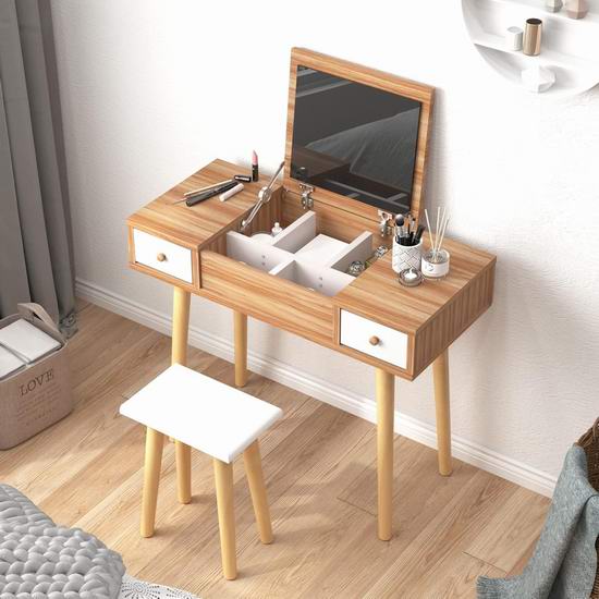 这款梳妆台配有两个抽屉、一个翻盖镜子和一个带隔板的储物格,不仅可以用作电脑桌、学习桌、写字台或办公桌,还可以用作化妆梳妆台,一桌多用,适合卧室或书房的小面积区域使用。梳妆台主要采用E1级PB板制成,天然环保,桌腿和凳腿采用松木材质,结实耐用;桌面防水防刮,最大承重50公斤,软垫凳子表面为PU皮革,易于清洁,最大承重45公斤。