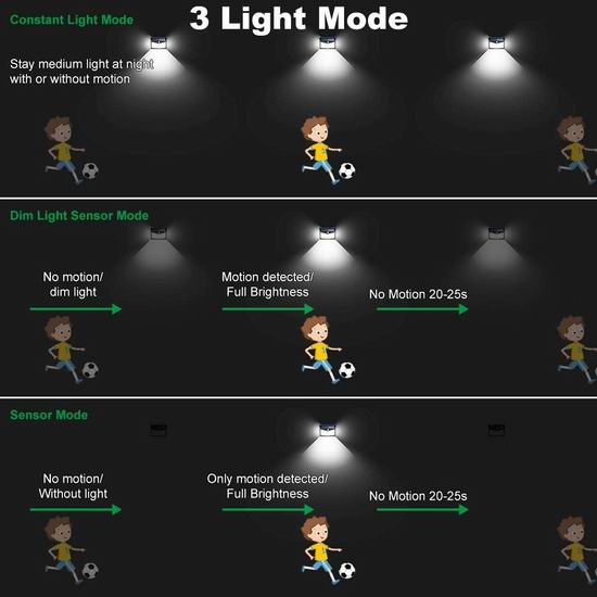 配备208 LED灯珠,270°三面照明,探测角度高达270度,有效探测距离26-33英尺,三种照明模式,20-25秒后自动熄灭,防水设计,内置隐形开关,可安装于前后院与车库门口,智能感应周边移动物体。