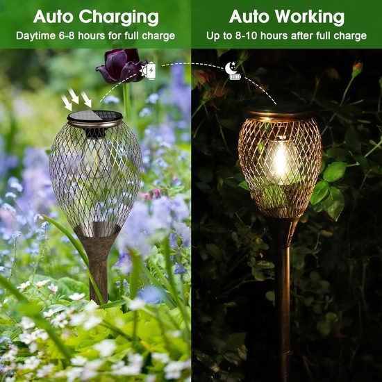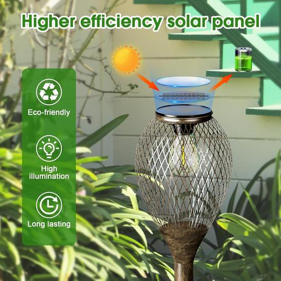 这款升级版太阳能景观灯采用复古的古铜色金属外壳,配有独特的复古灯丝灯泡和坚固的灯杆,材料持久耐用。镂空金属编织的灯罩不仅增强了灯光效果,还防止了积水和起雾的困扰。它是装饰花园、草坪、小径或庭院的理想选择,提供柔和温暖的光线,营造出完美的氛围。该太阳能灯通过升级的多晶太阳能电池板供电,具备高达22%的转换率,在阳光充足的条件下充满电后,能够整夜为您的户外空间提供照明。