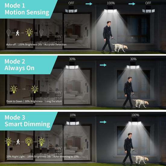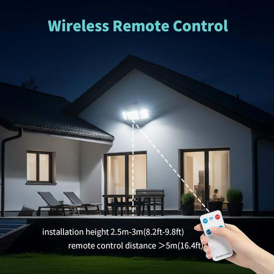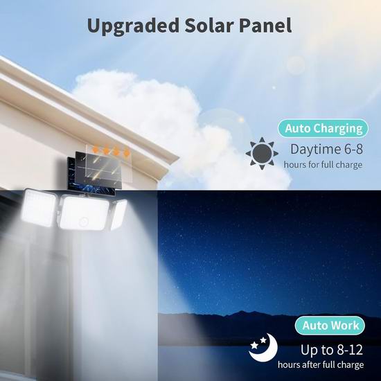 这款太阳能感应灯配备三个可调节灯头,提供270°广角照明,感应距离高达23英尺。配备遥控器,方便选择合适的模式:1.灵敏高亮模式;2.常亮模式;3.调光模式。具有IP65防水性能、抗冲击性、耐高温和耐低温性能,即使在恶劣天气下也能稳定运行。内置1800毫安时电池。可在白天自动充电,并在黄昏时自动开启。