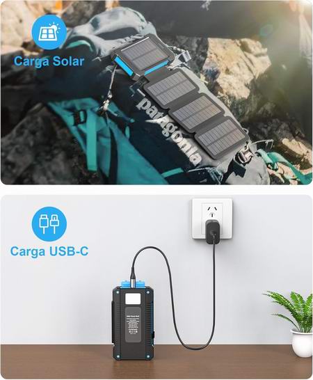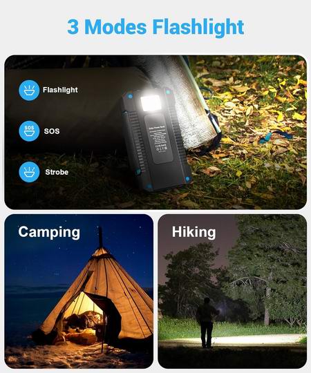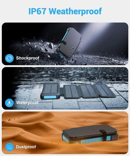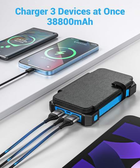 这款移动电源具有38800mAh大容量,足够为手机充电6-7次。配备4块高性能太阳能电池板,在阳光直射下可达到5-8W充电功率。内置2 个USB-A接口和1个 USB-C接口,可同时为3台设备充电。内置手电筒,具有照明、SOS和闪光3种模式,充满电时,可提供长达120小时的照明。