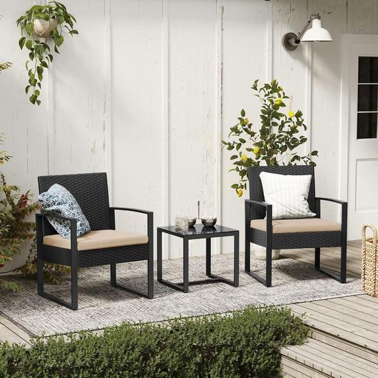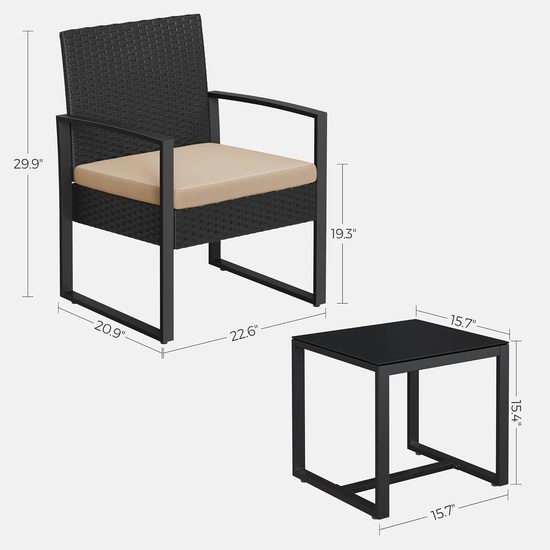 这款手工编织的PE藤条庭院家具套装增添了花园的特色和魅力,同时具备现代设计,适合室内外使用。无论是在露台、泳池边、后院还是门廊,这套家具都为您提供一个放松的角落,享受早晨的咖啡或夜间的葡萄酒。规格包括黑色和米色的选择,采用PE藤条、粉末涂层钢和钢化玻璃材料。单人椅尺寸为22.6 x 20.9 x 29.9英寸,边桌尺寸为15.7 x 15.7 x 15.4英寸,总重量36.4磅,椅子最大承重286磅,桌子最大承重66磅。