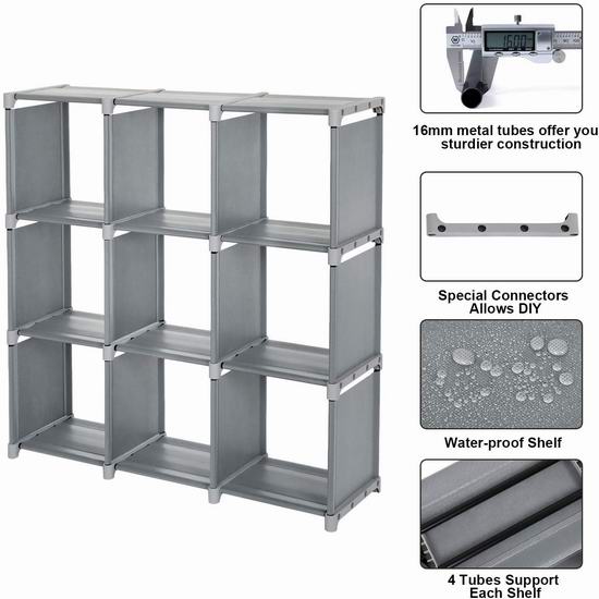 此款组合柜采用16mm金属管结构,优质PP接头,防水无纺布隔层,防潮耐污,拆卸自由,组装简单,清洁便利,共9格,可让您尽情的发挥创意,组装出各种高度,风格,造型的家居收纳组合,以满足不同装修或实用需要的家庭。可用做衣柜,鞋柜,书架,厨具柜,食品存放架等使用,方便实用,造型百变,每格可承重15.5磅,整体承重135磅。