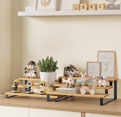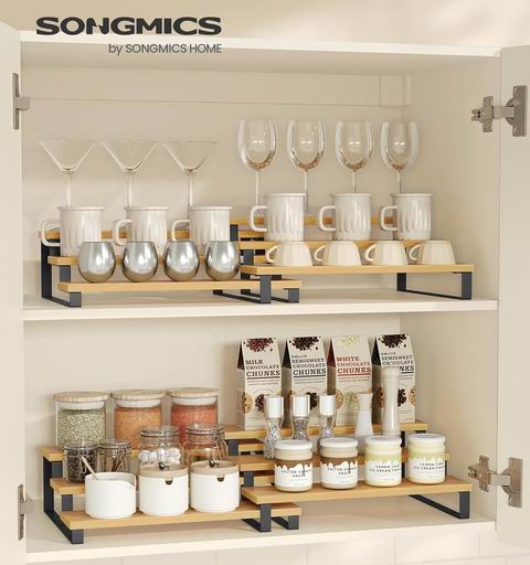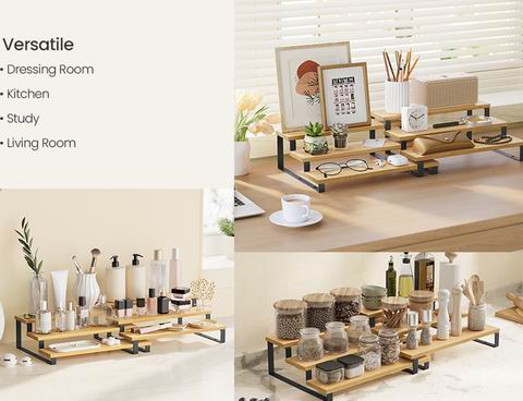 采用自然米色与墨黑色拼接设计,三层结构兼具实用与美观,既可作香料架、香水收纳架、甜点展示架,也可用于化妆品或摆件陈列。每层深度约3英寸,层次分明,一目了然,帮助台面保持整洁有序。套装可自由组合扩展,也可拆分为两个独立置物架灵活摆放。由工程木与金属打造,单层承重约6.6磅,稳固耐用,适用于厨房、餐桌、梳妆台或店铺展示等多种场景。