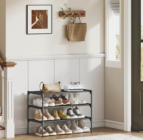 SONGMICS 三层鞋架(墨黑色)尺寸 29.7×62.3×53.5 厘米,结构稳固、收纳力强,每层可放约 4 双女鞋或 3 双男鞋。采用加厚金属管、坚固塑料连接件及抗撕裂无纺布搁板,耐用稳固。支持堆叠使用或拆除层板以存放高筒靴,灵活定制空间。安装简单,无需工具,几分钟即可完成。紧凑设计适用于玄关、客厅、卧室或衣柜,帮助保持居家整洁有序。