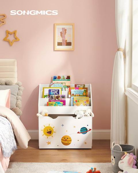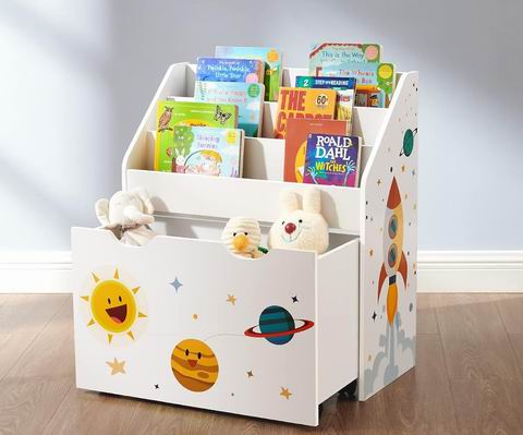 采用太空主题设计,集三层书架与带轮储物盒于一体,帮助孩子养成整理习惯。高度适中、圆角设计与防倾倒装置保障安全,雕刻把手方便取用。优质中密度纤维板与刨花板结构稳固耐用,表面易清洁。附带清晰说明书,安装简便,是儿童房与游戏区的理想收纳选择。