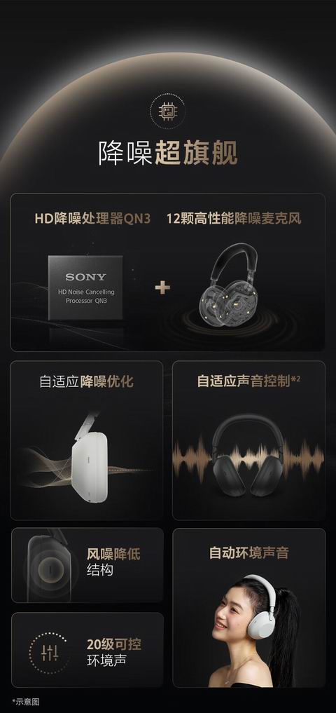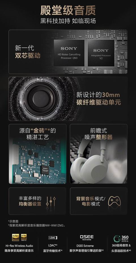 索尼 WH-1000XM6 无线降噪耳机 隆重登场,再次刷新行业标准。它配备 新一代高清降噪处理器 QN3,速度比 QN1 快 7 倍,搭配 12 麦克风适应降噪系统智能感知环境噪音并实时优化,让每一段旋律都纯净清晰。这款耳机由 索尼与世界顶级母带音频工程师联合打造,配备轻质碳纤维球顶驱动单元,实现录音室级的高保真音质,细腻呈现人声与乐器层次,忠实还原艺术家原声。在通话方面,六麦克风 AI 波束成形系统防风结构可精准捕捉语音,有效过滤环境噪音,让每次通话都如面对面交谈般清晰。设计上,WH-1000XM6 采用 轻盈折叠结构与磁吸收纳包,便携优雅;不对称头带与柔软皮革耳罩 带来全天舒适佩戴体验。续航方面,提供 30 小时超长电力,支持 快充 3 分钟播放 3 小时,无论通勤还是长途旅行,都能持续沉浸于静谧的高解析音质之中。