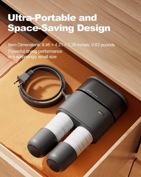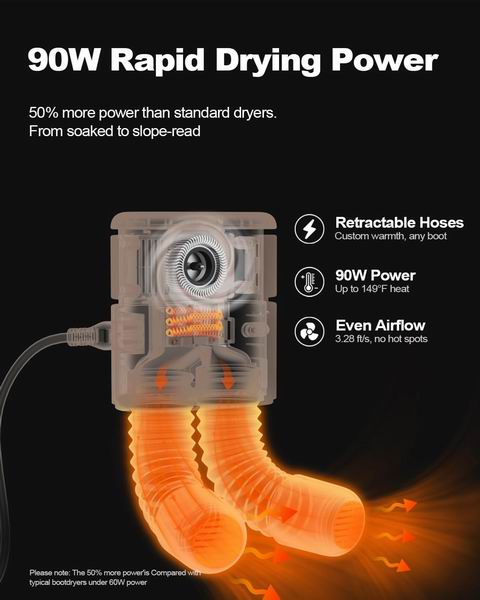 SOTHING 90W 便携式烘鞋器通过 149℉(约 65℃)温和热风快速烘干鞋靴与装备,配 11.81 英寸可伸缩软管以适配滑雪靴、工作靴、运动鞋以及袜子、手套等多种尺寸并实现均匀干燥;支持 3/6/9 小时定时,机身仅约 0.82 磅、体积小便于旅行收纳,运行噪音低至约 30 分贝;内置过热保护,超温自动停机、冷却后自动恢复,兼顾安静与安全使用。