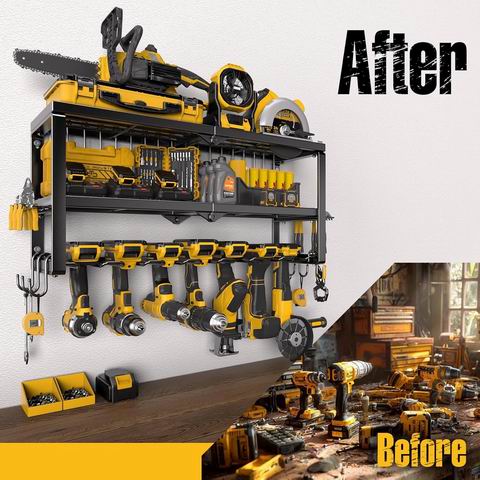 三层大型电动工具收纳架,适用于车库、工具房等场所,可存放无绳电钻,承重320磅,重型电动工具架,带电池支架。
