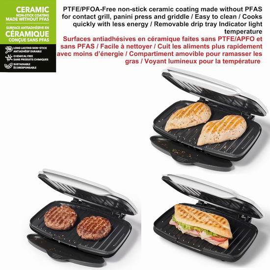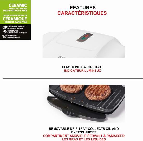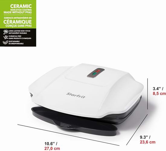 采用陶瓷不粘涂层,易于清洁,不含 PTFE、APFO 和 PFAS。功率高达1000瓦,提供稳定的热量,烹饪食物速度更快,能耗更低,提高效率,缩短烹饪时间。带照明的温度指示器可精准控温,确保每次烹饪都完美无瑕;可拆卸的油脂收集盒让清洁变得轻而易举。