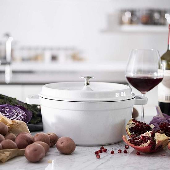 STAUB珐琅铸铁锅被誉为“法国国宝”,由欧洲最大的锅具生产公司——法国STAUB公司生产。凭借其独特创新的设计和绚丽的色彩,STAUB在欧洲市场上取得巨大成功。在法国,几乎所有的三星米其林厨师都使用Staub厨具,其采用了手工模具铸造的方式,每个模具只用一次,每个锅自然也都独一无二。决定铸铁锅好坏的最大因素就是其加热是否均匀了,从这点上说,Staub和Le creuset可以说是不分伯仲。它们的制锅原理和材料都是极其相似的,都可以做到高端铸铁锅应有的高保温、加热均匀的特点。Staub都是采用的耐高温的不锈钢材料,优点是可以直接放入烤箱,缺点是易烫手,拿的时候可要带好手套哟。而且Staub还推出了可以替换的公鸡、鱼、小猪、牛的knob,十分讨喜。