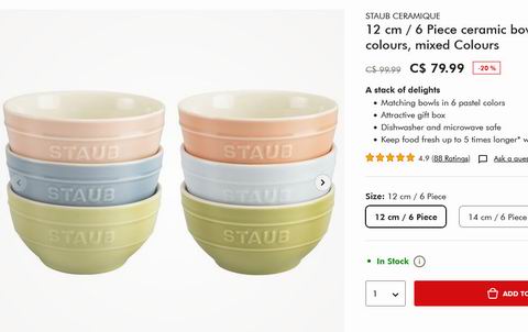 Staub Ceramique 混色陶瓷碗6件套  54.96加元(官网原价 99.99加元)