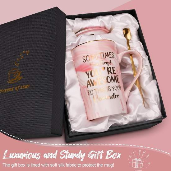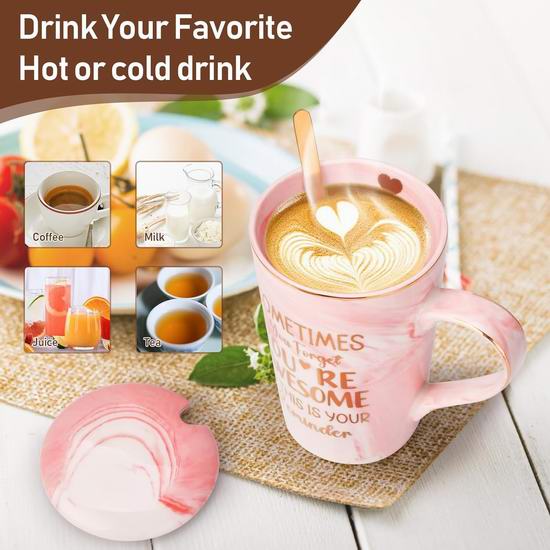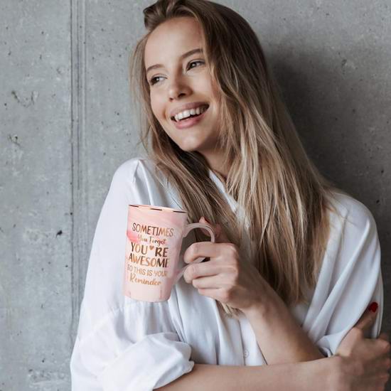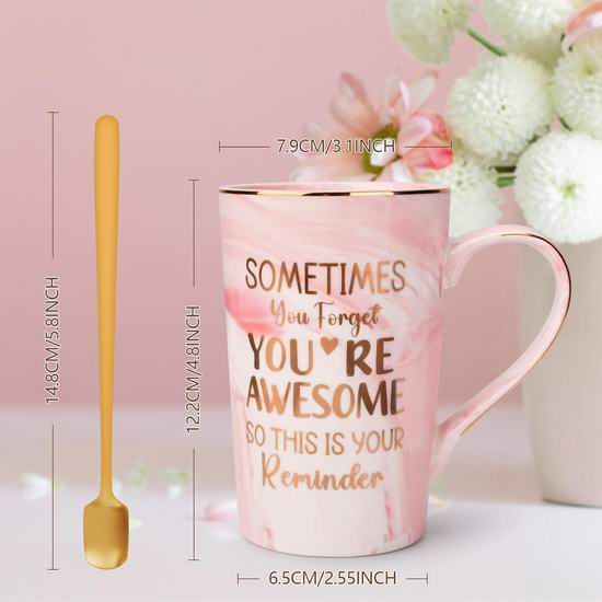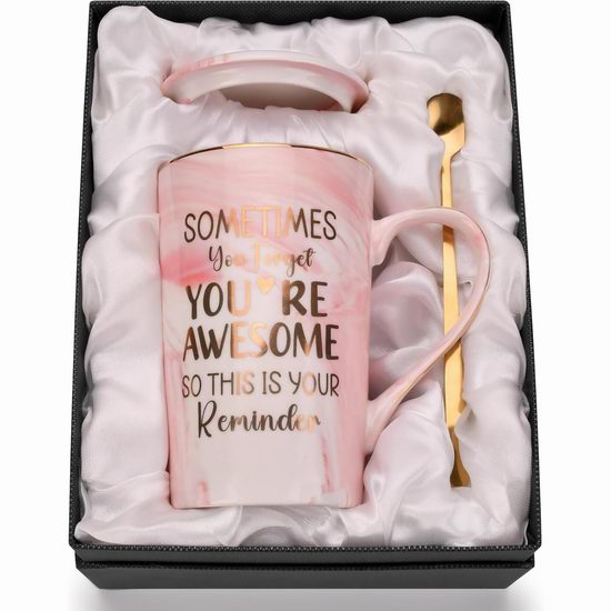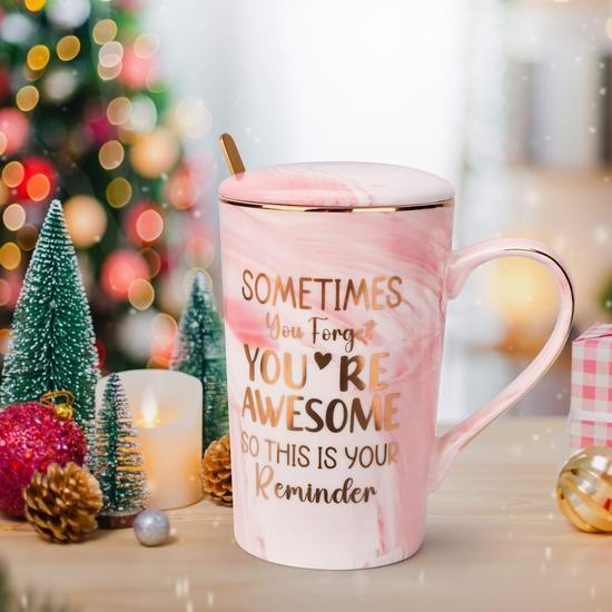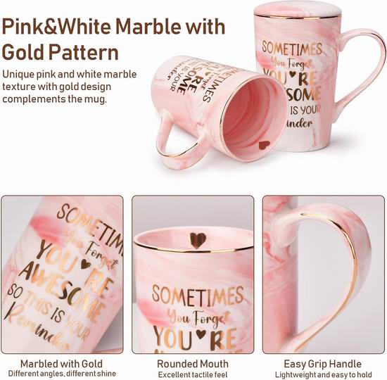这款14盎司粉色陶瓷马克杯拥有优雅的大理石纹理,饰以奢华的金色图案和边框,杯内还点缀着一颗独特的爱心。其精致的外观不仅使其成为日常用品,更是一件时尚的桌面装饰品。印有励志语录“有时候你会忘记自己很棒,所以这是给你的提醒”,为闺蜜、挚友、姐妹、妻子、母亲、同事等女性带来温暖的鼓励。是生日、圣诞、情人节、母亲节、感恩节礼物的完美之选。套装包含马克杯、杯盖、勺子等。