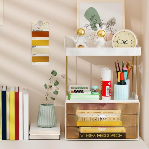 一款集大容量精致设计于一体的梳妆台整理神器。双层+三抽屉的升级结构:顶部两层开放式搁板可放置香水、护肤品等高频使用物品;下方三个带滑轨的抽屉则适合收纳眼影、防晒霜等小件。尺寸为12.5x6.9x17.3英寸,底部配有防滑硅胶垫,确保放置平稳。采用易于清洁的ABS材料与耐用的PET托盘、金属管,无需工具即可在30秒内快速组装。其琥珀色外观不仅适用于浴室和梳妆台,也可用于整理办公用品或文具。