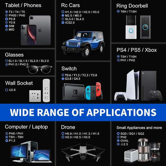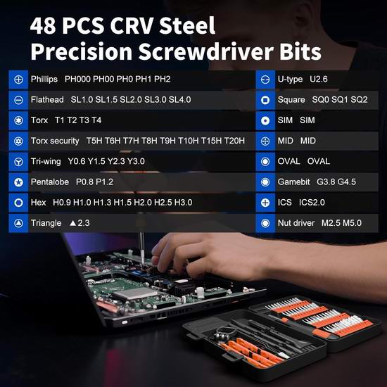 这款螺丝刀套装包含48个批头(十字、一字、星形、星形防盗、三角、五角、六角、三角、U型、方头、SIM卡、MID、椭圆、游戏批头、套筒扳手)。经过专业设计,可用于维修电脑、PC、笔记本电脑、MacBook、平板电脑、手机、PS4/PS5、Xbox、Switch、眼镜、无人机、手表、智能门铃等产品。
