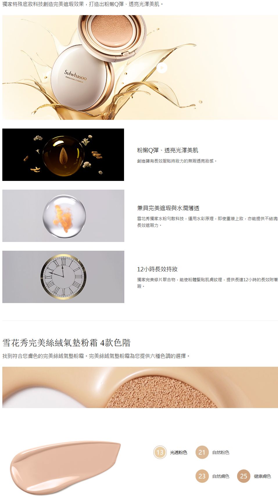 去韩国玩,雪花秀这个品牌绝对在必买清单前两名,雪花秀完美丝绒气垫粉霜有SPF50 + / PA +++ ,提供不分四季的高效防护,雪花秀拥有的“水粉 匀散科技,使完美丝绒气垫粉霜创造出10秒拍出保养级光泽,更加弹性与服贴,能紧密结合粉体紧贴肌肤纹理提供长效附着力,让妆感愈加持久无瑕从20000种药材中,精心筛选出300种珍贵药材,研发出雪花秀独家核心成分「滋阴丹」配方,提供滋阴润补功效,为肌肤增添所需要的营养,它被运用替代一般粉底的水分,奢侈得注入于完美丝绒气垫粉霜之中,也就是边上妆边保养的概念。