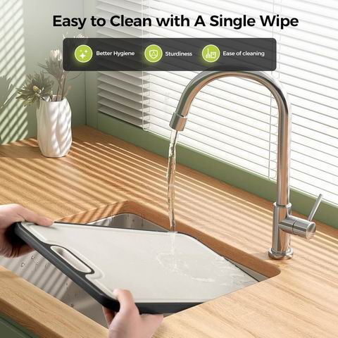 采用99.9%纯钛材质,另一面为食品级PP材质,可区分处理生熟食材,卫生实用。钛面不易产生刀痕、不吸附异味,减少食物残渣残留;PP面配有深汁槽(可容纳约200ml液体)和蒜姜研磨区,方便烹饪准备。双面材质均易清洁,不易粘附污渍,配有便携圆环便于悬挂收纳,是兼顾耐用性与实用性的厨房工具。尺寸大小:约16×10英寸。
