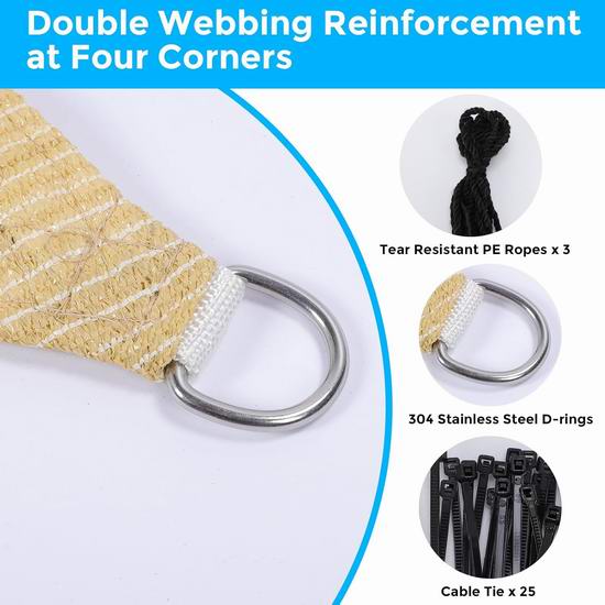这款遮阳篷采用透气透水网布,可促进空气流通和水流,在有效阻挡阻挡强烈阳光和热量的同时,营造凉爽的氛围,并允许光线透过。双缝织带边缘和坚固的接缝,以及弧形侧面,增强了张力并防止下垂,从而保持帆的形状和使用寿命。每个角都配有不锈钢扣,将两个角安装得较高,有利于有效排水,防止积水。
