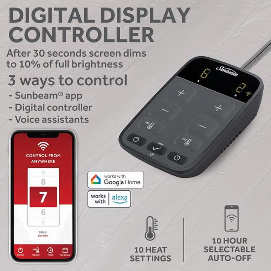这款智能电热毯内置WiFi,可通过Sunbeam应用程序、语音助手或有线数字控制器随时随地进行控制。可提前预设温度和时间表,或直接在手机上远程预热,让您舒舒服服地钻进温暖舒适的被窝。即使在黑暗中,也可以使用 Amazon Alexa 和 Google Assistant 进行语音控制。还可通过有线数字显示控制器自定义设置,床垫两侧均可独立控制,实现个性化的温暖体验。ComfortSL加热技术采用 Sunbeam 最纤细、最柔韧的加热丝,能够感知温度并自动调节,确保整晚恒温。柔软舒适的面料采用 100% 聚酯纤维制成,让您安享舒适睡眠。提供 10 档温度设置,支持10小时自动关机和60分钟加热确认提醒,方便您随时掌握温度。