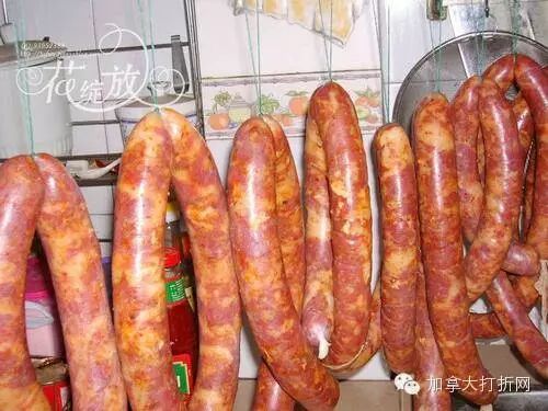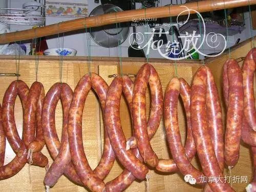 4、风干发酵:春夏秋三季用日晒到干为止。冬季用火墙烤2个小时后,里外倒一镒再烤2个小时,也是到皮干为止。然后挂在阴凉通风处,风干3—4天后取下扎捆,每捆12根,将捆好的香肠放在干燥阴凉通风的仓库内,发酵10天左右取出,以上各道工序总共不得超过一个月的时间,时间过长易引起变质。