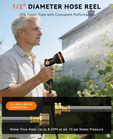 SUNPOW 可伸缩花园软管卷盘(1/2 英寸 × 100 英尺)采用壁挂式设计,配备 3/4 英寸黄铜接头与 10 功能喷嘴,支持自动慢速回卷与任意长度锁定,内置导向系统可减少打结与缠绕。180° 旋转底座覆盖范围更广,轻松应对草坪、花园、露台与车道等大面积区域。喷嘴提供雾状、喷射、淋浴、扁平、锥形等多种模式,适合浇花、清洁、洗车与宠物冲洗等多场景使用。随附墙壁支架、螺丝与安装配件,安装便捷,结构坚固耐用,是日常庭院浇灌与清洁的实用户外方案。