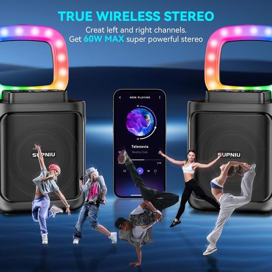 这款蓝牙音箱具有30瓦输出功率,搭载4英寸全频驱动器和低音反射管,可实现更深沉和自然低音,失真更少,具有清晰的立体声,为您带来难忘的聆听体验。支持蓝牙5.0技术,快速配对,还使用AUX电缆通过3.5毫米音频插孔连接设备播放音乐。支持通过单个设备连接两个 SUPNIU S50 蓝牙音箱,即可获得身临其境的立体声和高达 60W 的大音量。内置的LED灯光(可关闭)可​​随着节拍舞动,营造出火热的派对氛围。配备高容量可充电电池,续航时间长达7-24小时。