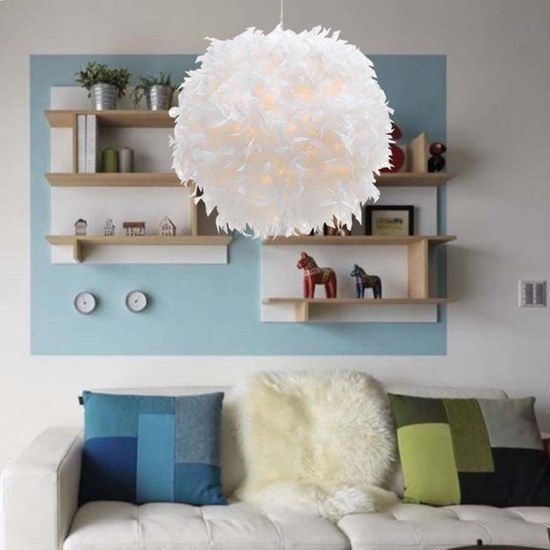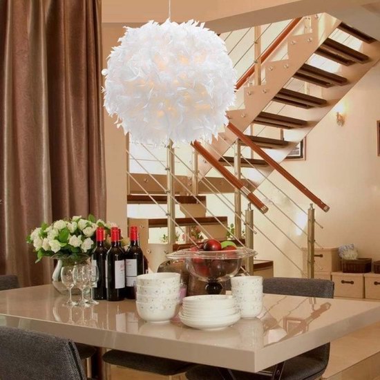 精选优质白色羽毛灯罩,洁白光滑,不易脱落,层次感丰富,北欧简约设计,时尚百搭,浪漫唯美,透过灯罩,光线更加柔和温暖,羽毛灯罩直径40.6厘米,电源线长17英尺(5.18米),本品不含灯泡,可安装功率40瓦以下的节能灯。