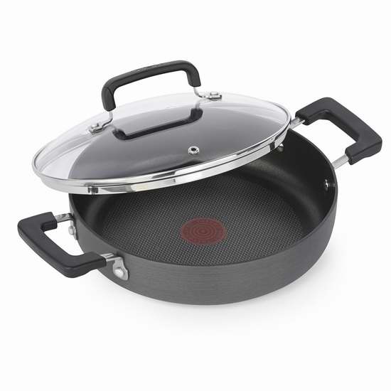 T-fal特福独特的红点技术,锅体均匀受热后会显示红点,可锁住食物风味。耐高热不粘锅内部异常经久耐用,并且防划,硬质阳极化处理,可洗碗机机洗,结实耐用。硬质阳极化抗弯曲底座具备良好的抗弯曲功能,能够均匀加热,达到超凡烹饪效果。铆接硅胶手柄,可加热至350华氏度,可用于除电磁炉外的任何烹饪方式。