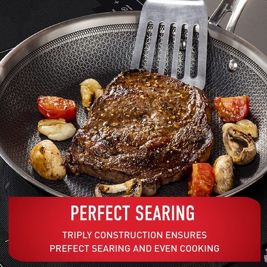 “蜂窝不粘锅” 在市场上受到消费者热捧,不仅互联网平台销量逐年攀升,社交平台上也收到无数称赞,成为消费者心中口碑爆棚的不粘锅。T-Fal蜂窝深炒锅,整锅一体成型,采用食品级不锈钢+铝+不锈钢三层结构,内部涂层通过高精技术升级到全面屏蜂窝晶纹不粘锅体,强化速热导磁,受热均匀且快,食物始终悬浮于锅壁物理颗粒之间,不易粘锅,清洗也变得相当简单,防刮耐磨耐腐蚀,即使是使用金属锅铲也不怕。适用于各种电炉、煤气炉和电磁炉,配备钢化玻璃锅盖和不锈钢锅铲。洗碗机安全,烤箱安全至250°C/482°F。如果需要盖子,可在华人超市购买28厘米玻璃盖,一般售价6元左右。