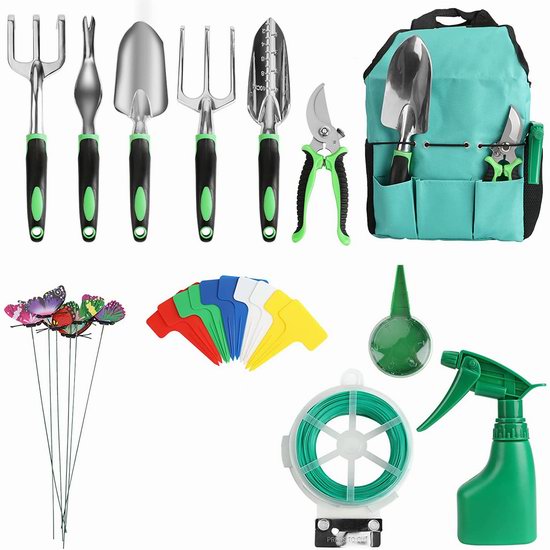 采用重型不锈碳钢+铝材质制成,坚固耐用,高硬度强度,不会生锈,柔软防滑橡胶手柄符合人体工学设计,减少手部压力,套装包含各种园艺工具,配备收纳袋。