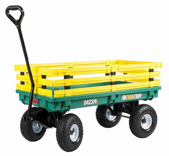 采用高抗冲聚丙烯塑料车斗和栏杆,4x10超大充气轮胎,长手柄易于拖行,加拿大制造。外形尺寸为106.7 x 55.9 x 25.4厘米。