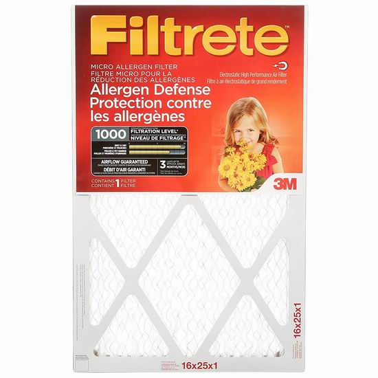优惠3M Filtrete 1000 MPR 防过敏家庭空调暖气炉过滤网(4个装 16x25x1英寸) 34.98加元!